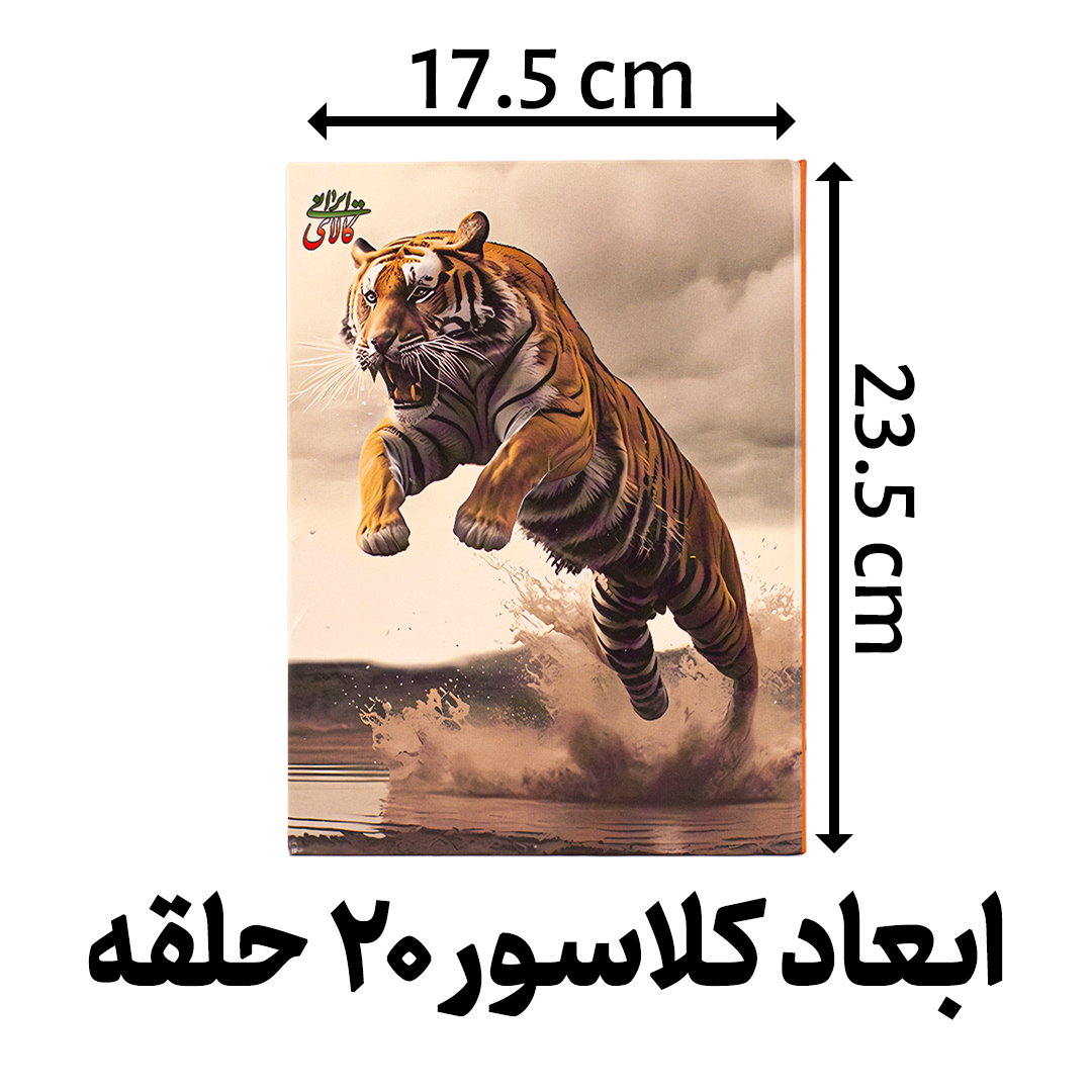 کلاسور 20 حلقه تهیه شده از جنس مقوای ضخیم صنعتی با روکش کاغذ چاپ شده طرح دار به همراه روکش سلفون مات یا براق که دارای تنوع طرح بالا و ترکیب رنگ زیبایی است؛ جنس قفل کلاسور از جنس فلز می‌باشد؛ که برای باز و بسته شدن‌های متوالی جهت چیدمان و جابجایی کاغذ‌ها دارای مقاومت بالاتری نسبت به قفل پلاستیکی می باشد و ظرفیت قرار دادن 160 برگ کاغذ در آن وجود دارد. از ویژگی های این محصول قابل استفاده بودن کاغذ های 20 حلقه ی موجود در بازار برای این کلاسور می باشد. محصول به همراه 80 برگ کاغذ و 1 عدد دیوایدر مقوایی ارسال می شود