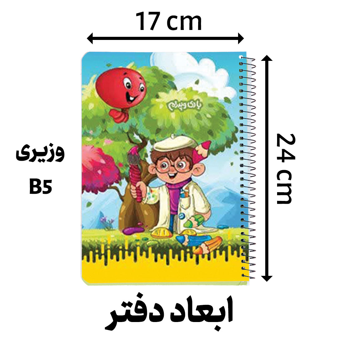 دفتر مجلد طرح های رنگی 50 برگ تهیه شده از جنس مقوای چاپ شده سلفون شده مات و براق جلد شده در ابعاد 24x17 سانتی‌متر، قطع وزیری که نوع صحافی آن فنر مارپیچ فلزی می باشد.