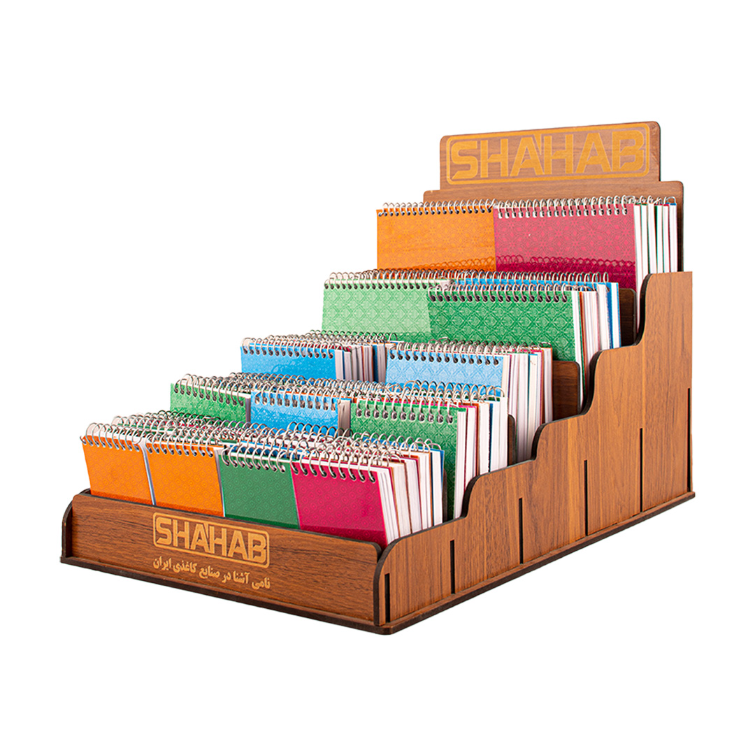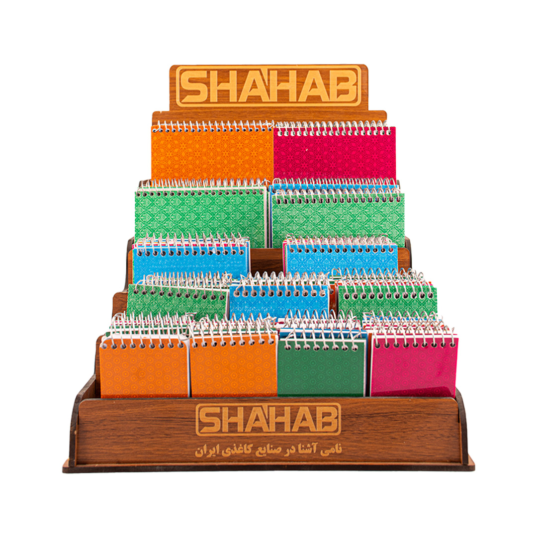 اسنتد یادداشت سلفونی مدل لامینتی سیمی 80 برگ که دارای دفاتر یادداشت در 5 ابعاد و 4 تنوع رنگی مختلف و به همراه اسنتد چوبی جلد از جنس سلفون لامینت شده .از ویژگی های آن ها: قطع عمودی ، فنر مارپیچ فلزی ، با کاغذ سفید 60 گرم خط دار اشاره کرد. استندشامل تمامی ابعاد دفترچه و رنگ ها می باشد.