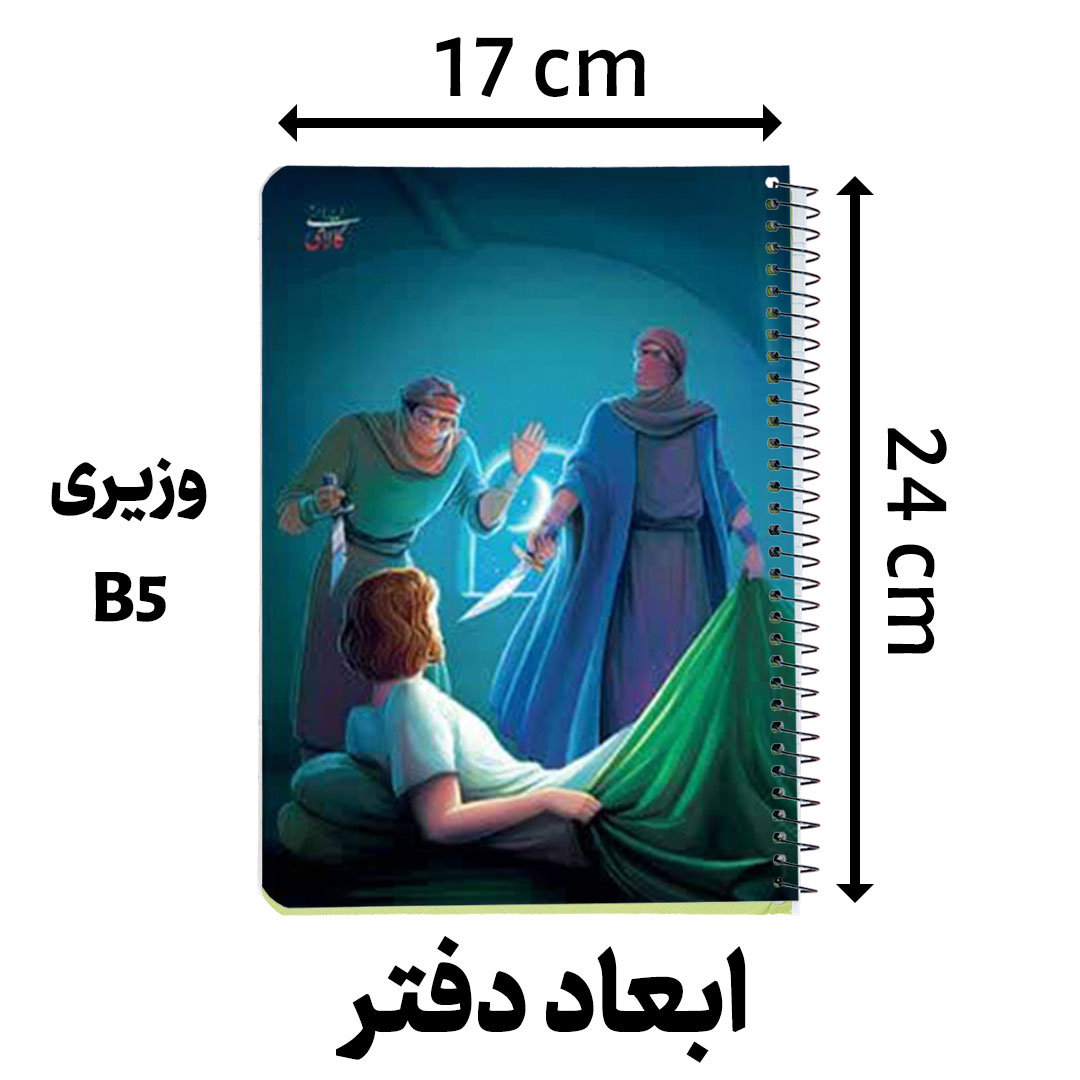 دفتر مجلد طرح های رنگی 50 برگ تهیه شده از جنس مقوای چاپ شده سلفون شده مات و براق جلد شده در ابعاد 24x17 سانتی‌متر، قطع وزیری که نوع صحافی آن فنر مارپیچ فلزی می باشد.
