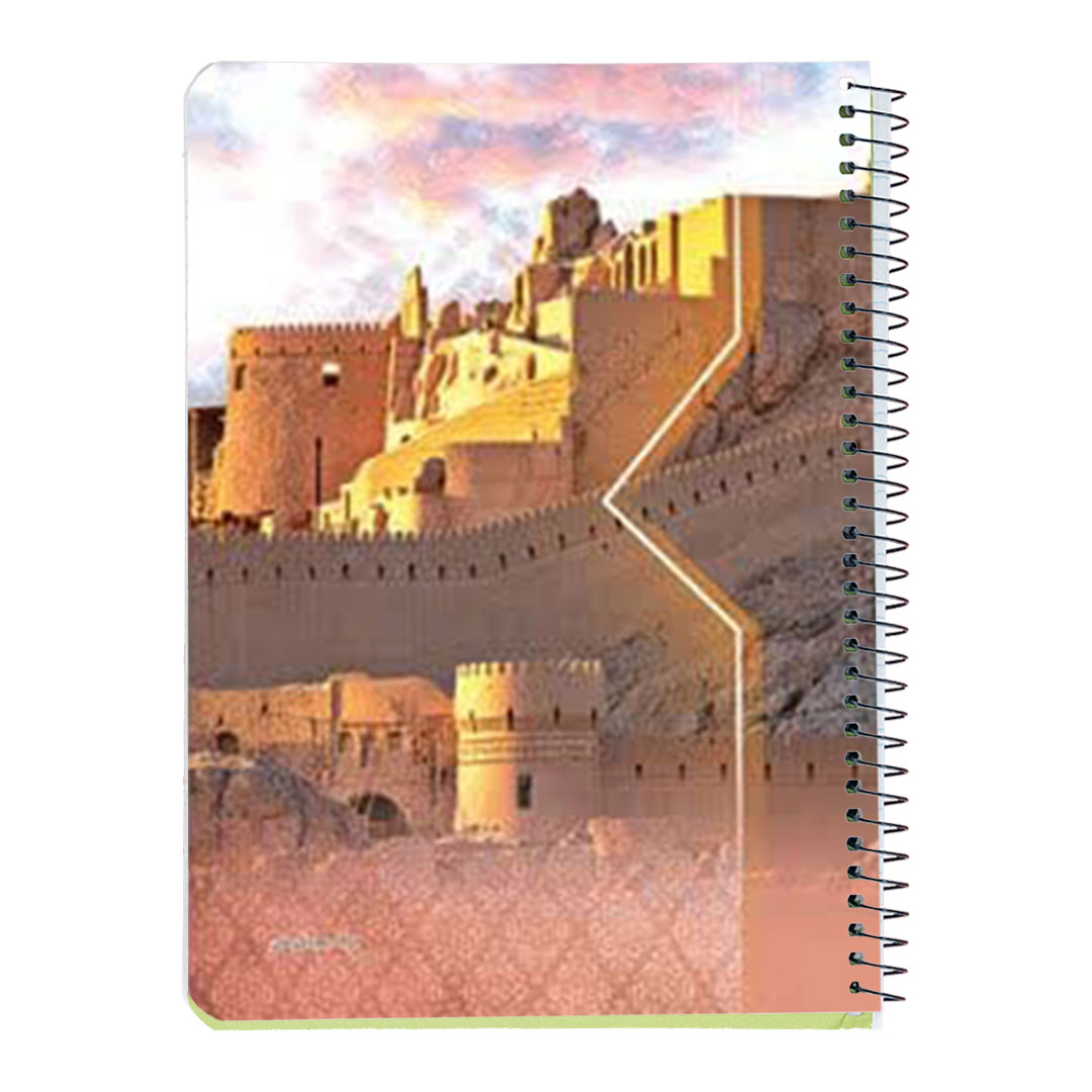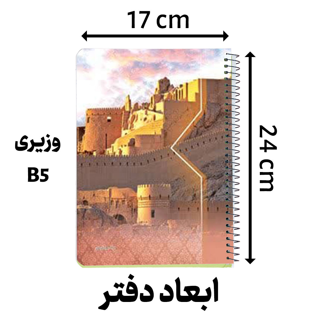 دفتر مجلد طرح های رنگی 50 برگ تهیه شده از جنس مقوای چاپ شده سلفون شده مات و براق جلد شده در ابعاد 24x17 سانتی‌متر، قطع وزیری که نوع صحافی آن فنر مارپیچ فلزی می باشد.