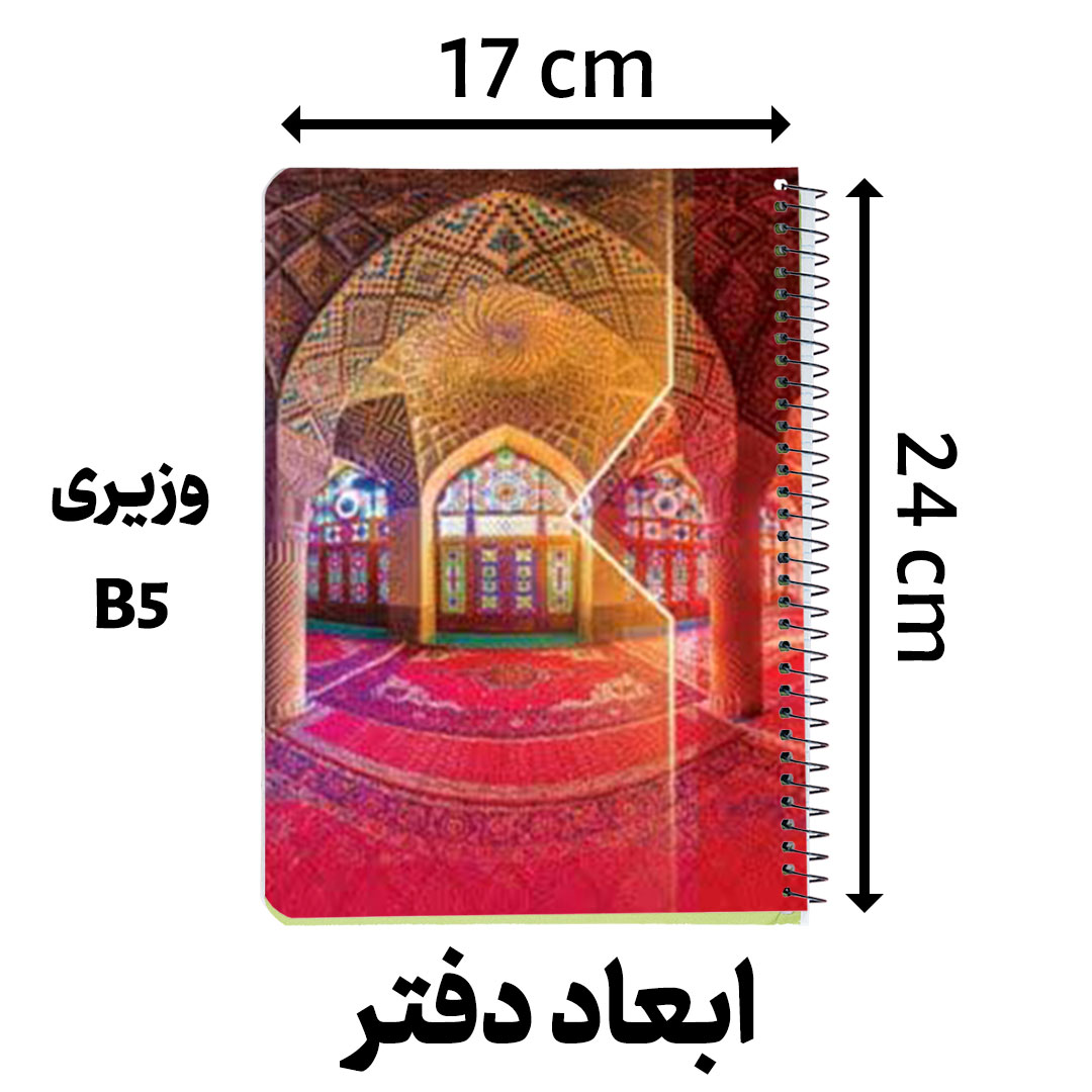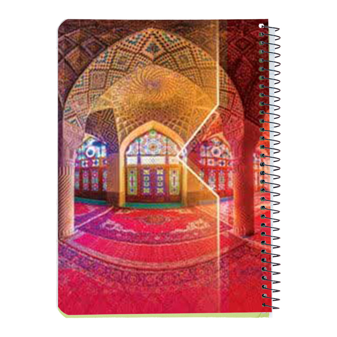 دفتر مجلد طرح های رنگی 50 برگ تهیه شده از جنس مقوای چاپ شده سلفون شده مات و براق جلد شده در ابعاد 24x17 سانتی‌متر، قطع وزیری که نوع صحافی آن فنر مارپیچ فلزی می باشد.