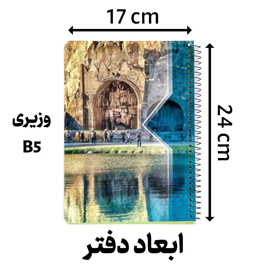 دفتر مجلد طرح های رنگی 50 برگ تهیه شده از جنس مقوای چاپ شده سلفون شده مات و براق جلد شده در ابعاد 24x17 سانتی‌متر، قطع وزیری که نوع صحافی آن فنر مارپیچ فلزی می باشد.