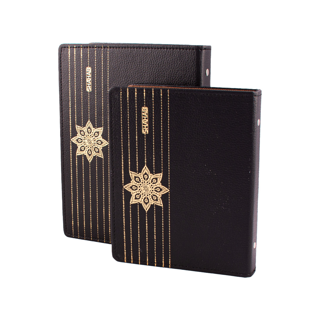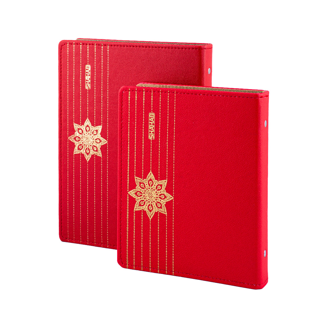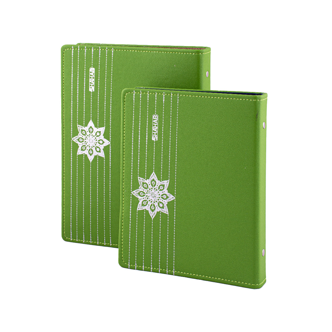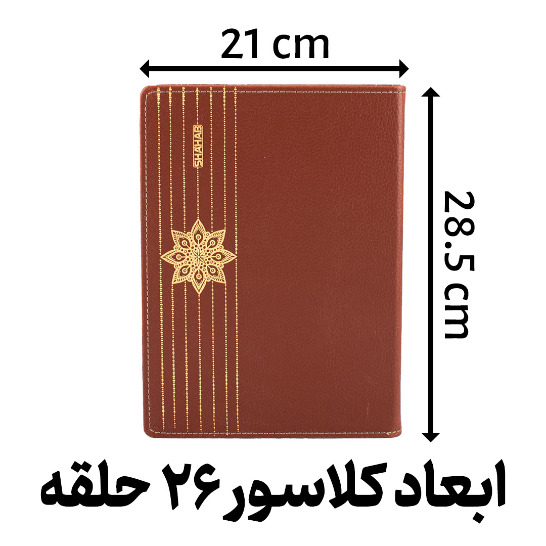 محصول اول: کلاسور 26 حلقه، روکش چرم مصنوعی، قفل فلزی حلقه ها، به همراه 80 برگ کاغذ با 4 عدد مقسم رنگی مقوایی
