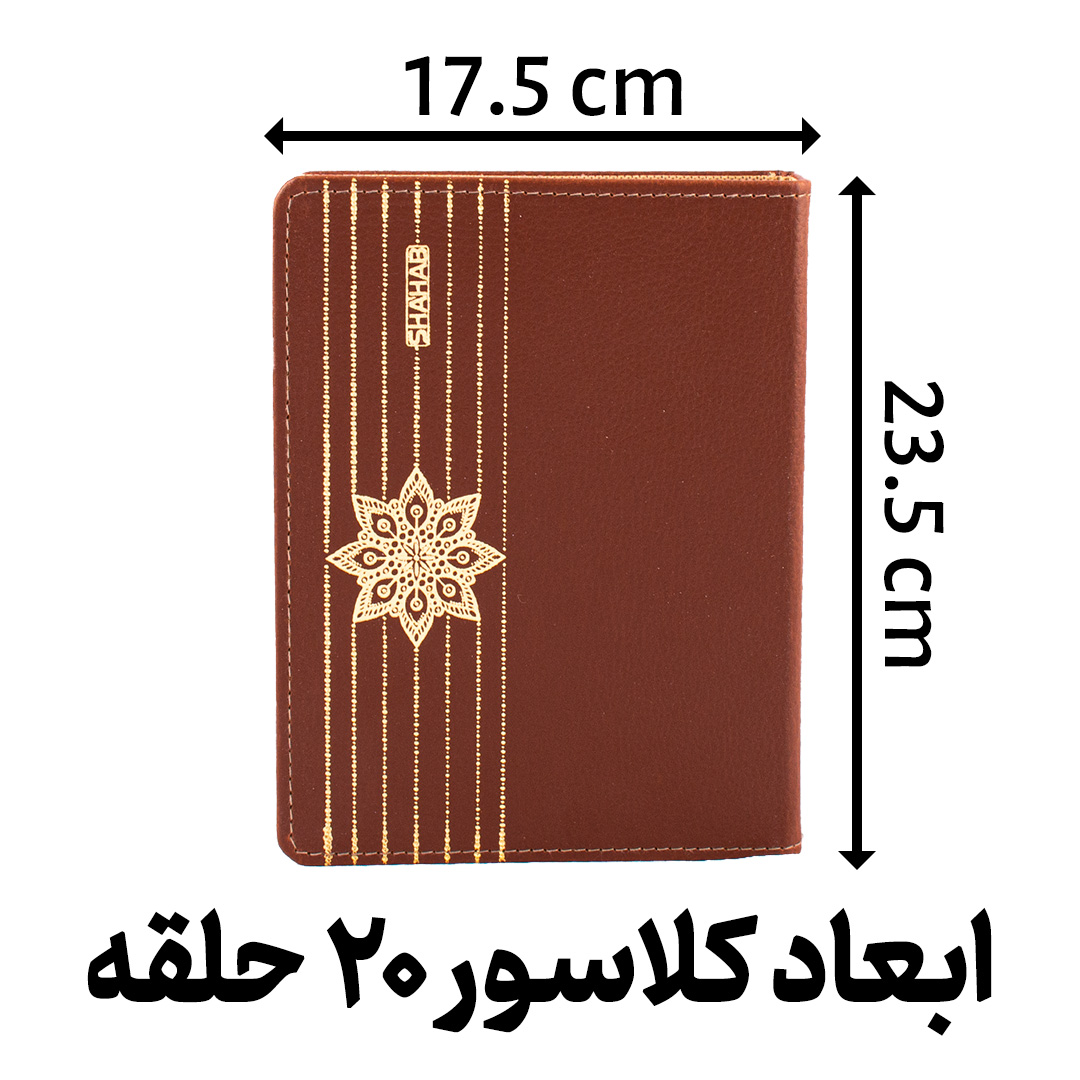 کلاسورهای 20 و 26 حلقه به صورت ست تهیه شده از جنس مقوای ضخیم صنعتی با روکش چرم مصنوعی باکیفیت، که بر روی آن طرح طلاکوب زیبایی شده است؛ علاوه بر دوام بالا دارای بافت و ترکیب رنگ زیبایی است که مناسب برای استفادههای متوالی میباشد. جنس قفل کلاسورها از جنس فلز میباشد؛ که برای باز و بسته شدنهای متوالی جهت چیدمان و جابجایی کاغذها دارای مقاومت بالاتری نسبت به قفل پلاستیکی می باشد و هر دو کلاسور ظرفیت قرار دادن 160 برگ کاغذ در آن وجود دارد. هر دو کلاسورها به همراه 80 برگ کاغذ می باشد؛ که از ویژگی های این محصول قابل استفاده بودن کاغذ های 20 و 26 حلقه ی موجود در بازار برای این کلاسورها می باشد.