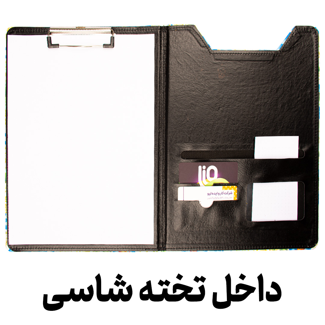 زیر دستی سایز A4 تهیه شده از جنس پارچه ای مخمل با حالت کلاسوری(تاشو) که رویه آن از جنس پارچه ای مخمل که با طرح های متنوع و زیبا و داخل آن نیز از جنس چرم مصنوعی تیره رنگ کار شده است که دارای جیب های متنوع(دو لَت) برای نگهداری کارت، مدارک و ... می باشد. این زیر دستی به طور کامل دور دوخت شده است که در تصاویر به خوبی دیده می شود. این محصول گزینه ی مناسبی برای افرادی است که به طور روزانه و دائم از زیر دستی و تخته شاسی استفاده دارند.
